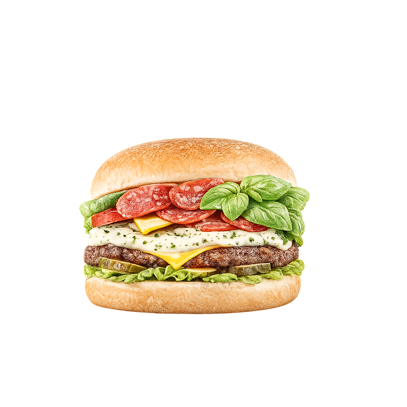 Steak hache 100 gr, confit d’oignons, oeuf, salami, cheddar, sauce andalouse. Ingrédients : Steak hache 100 gr, confit d’oignons, oeuf, salami, cheddar, sauce andalouse