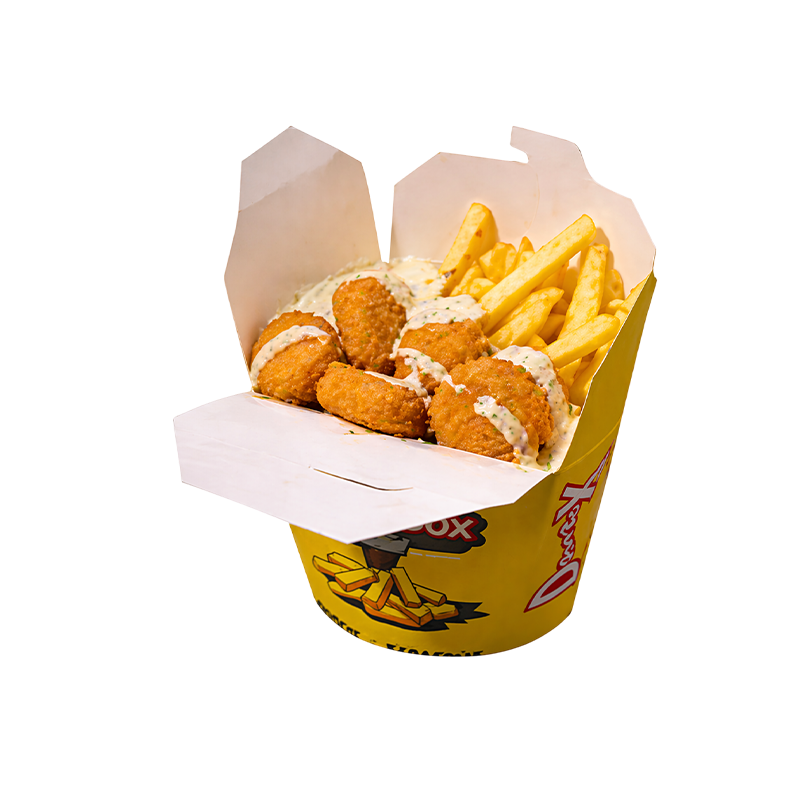 Box savoureuse composée de nuggets croustillants et d’un accompagnement gourmand, idéale pour un repas complet, chaud et facile à emporter.