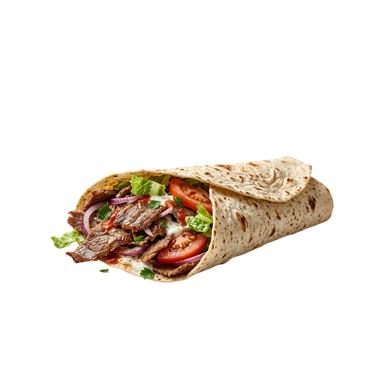 Galette roulee garnie de viande kebab, crudites fraiches et sauce onctueuse, ideale pour un repas pratique, genereux, complet et plein de saveurs.