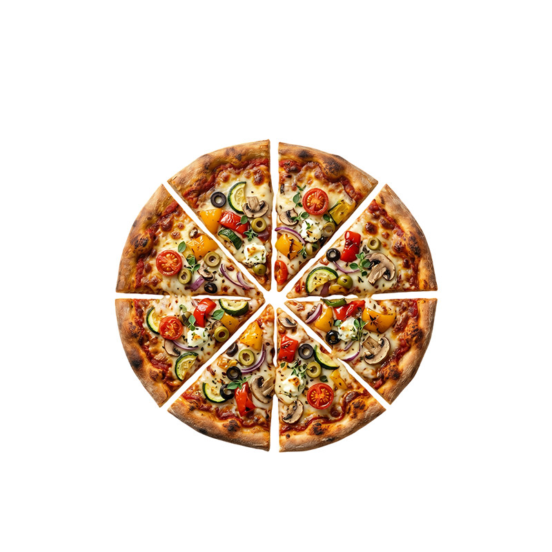 Sauce tomate, mozzarella, poivrons, champignons, olives, oignons, maïs. Ingrédients : Sauce tomate, mozzarella, poivrons, champignons, olives, oignons, maïs